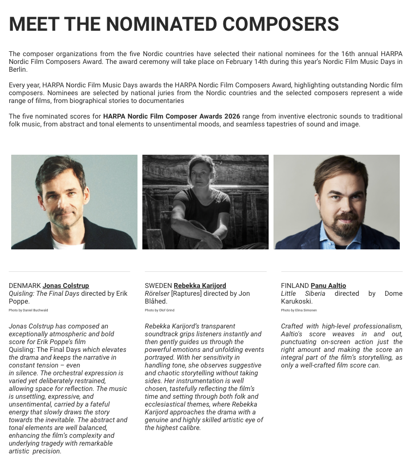 The score to ‘Quisling – The Final Days’ by director Erik Poppe got nominated for the Harpa Nordic Film Composer Award 2026 taking place in Berlin 13-16. https://shorturl.at/W8bbj